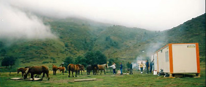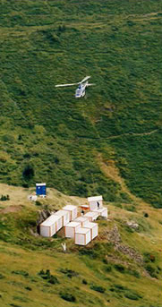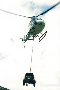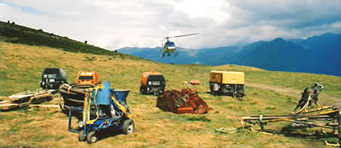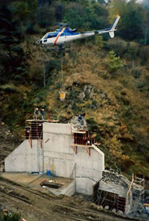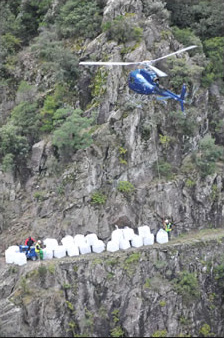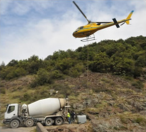 La toupie alimente les bennes que l’hélicoptère amène sur zone. Bouchage de puits dans les gorges du Chassezac (Ardèche)